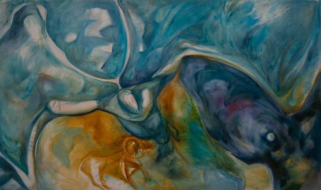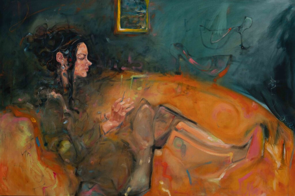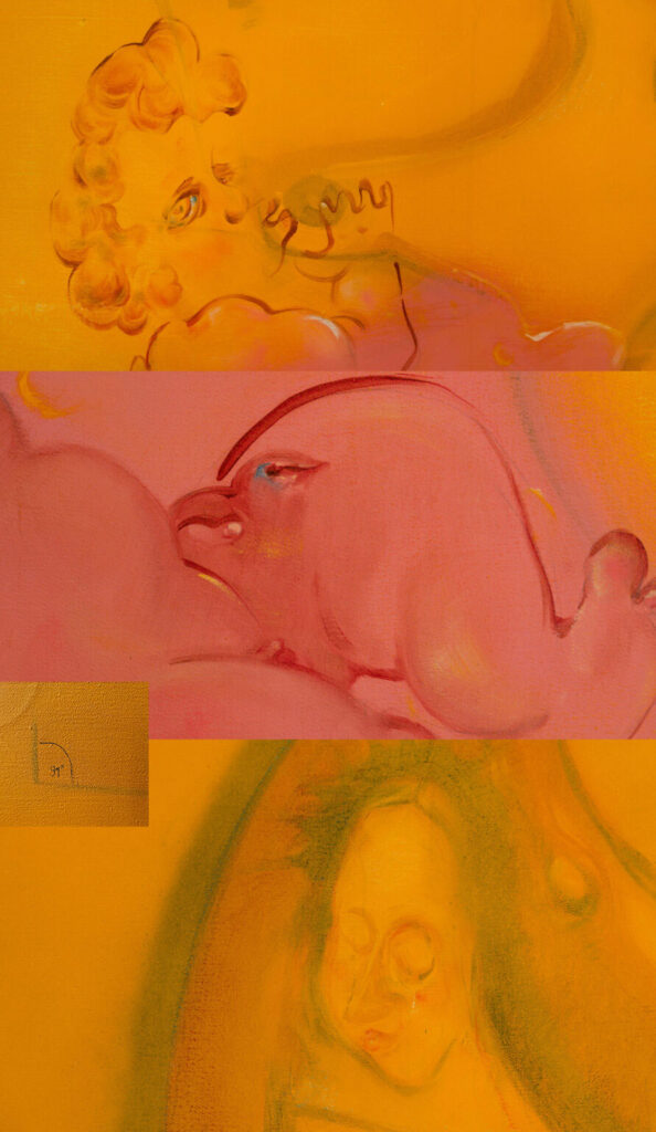 At the center, a child nestles against the mother’s breast, painted with disarming tenderness and feverish tension. The flesh tones shimmer as if seen through sacred light, while a faint blue around the eye betrays awakening — a lucid pulse within the dream. A small green bird hovers between their hands, fragile as a heartbeat, its simplicity echoing the purity of myth.